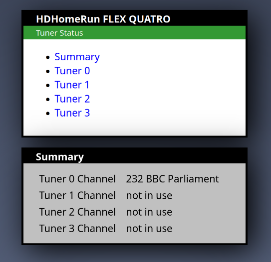 If you encounter issues (or are just curious), go to the HDHomerun in your browser and go to the “Tuner status” page. It should show the selected channel for one of the tuners. You can also check the TVHeadend console output.