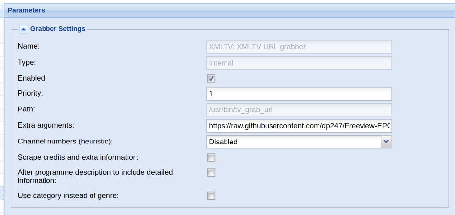 - Disable all except “Internal: XMLTV: XMLTV Url Grabber”