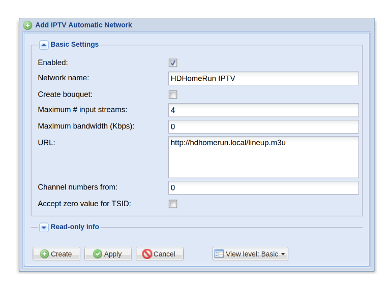 .htmlwith.m3u(e.g. http://hdhomerun.local/lineup.m3u). - Click “Create”